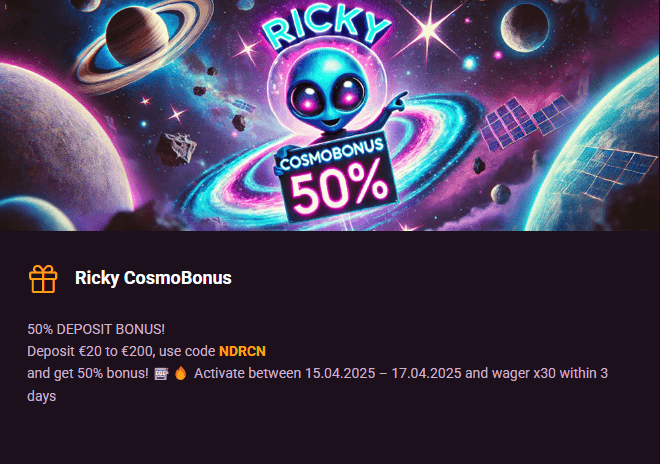 Ricky Casino’s CosmoBonus is a limited-time promo inspired by space-themed adventures, offering exclusive deposit matches and free spins.