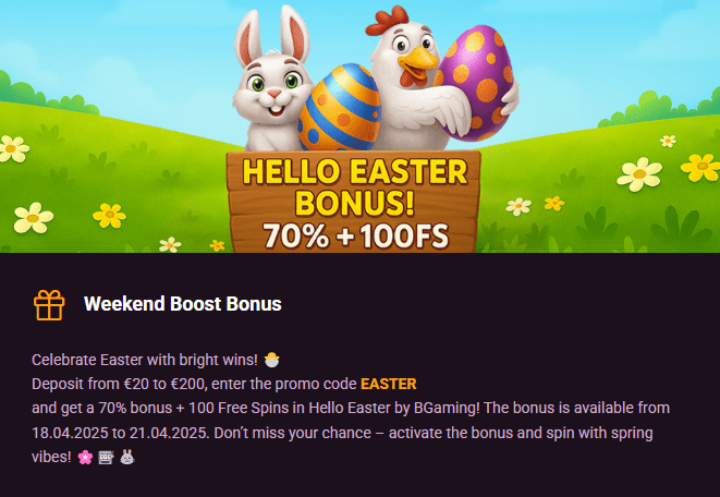 - Weekend Boost Bonus: Celebrate Easter with a 70% bonus and 100 free spins on the “Hello Easter” slot by BGaming. Use promo code EASTER when depositing between €20 and €200.